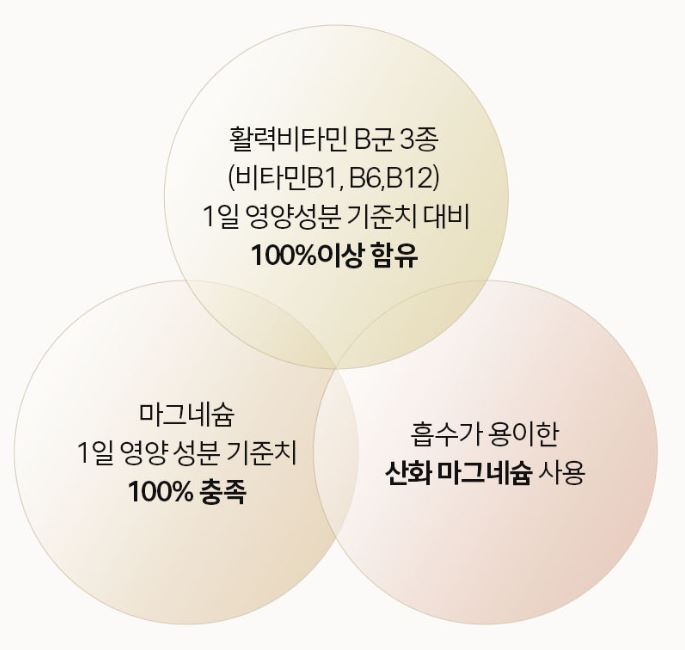 마그네슘은 세포 에너지 생산에 필수적인 미네랄이며, 비타민 B6는 에너지 대사를 촉진하는 역할을 해준다고 합니다. 이 두 영양소가 함께 작용하여 피로를 덜어주고 활력을 높여준다고 합니다.
