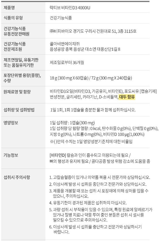 락티브 비타민D3 4000IU 권장량 및 주의사항